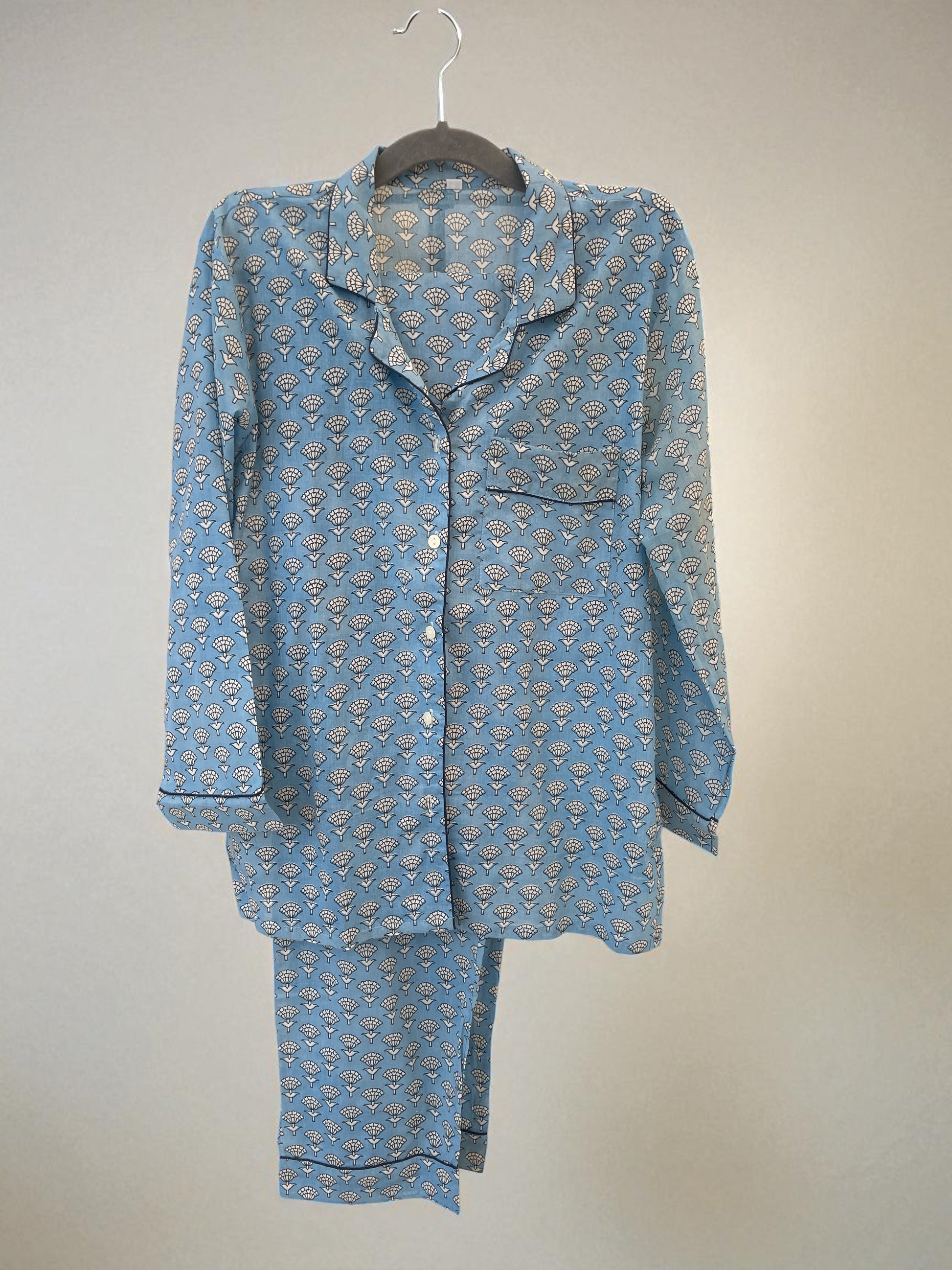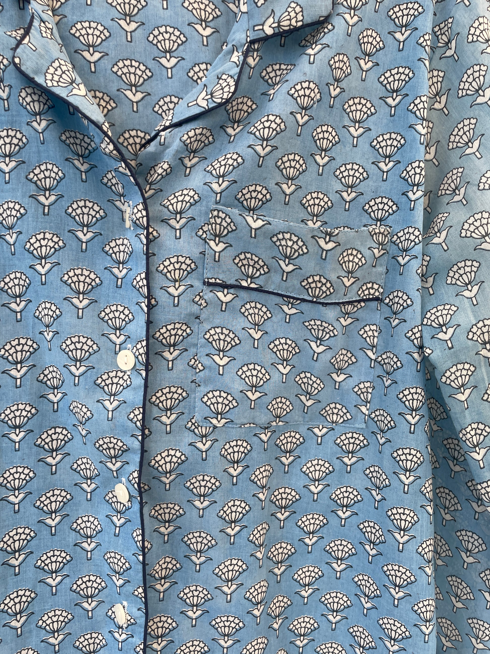 Crafted from soft, breathable cotton, these Blue Floral Block Print Long Pyjamas have been made using traditional hand block printing in a blue 'butti' floral pattern. The set includes a tailored long-sleeved shirt and drawstring trousers, designed for a small size, UK 8. Just perfect for lazy sundays at home. If you are between sizes I would recommend sizing up. Block printing is a hand printed technique and will contain flaws and imperfections which is part of its charm. All my pyjamas come in a cotton bag for neat storage and easy gifting. Please note this is a seconds sale item and all sales are final. There are is some slight fading to some of the cotton, every item I sell is thoroughly checked and to avoid wastage is sold at a discount.