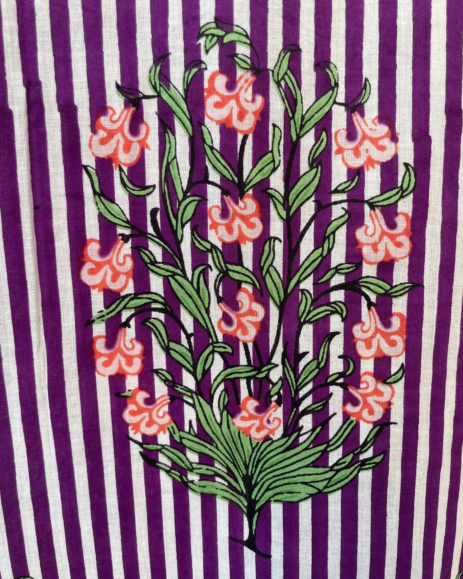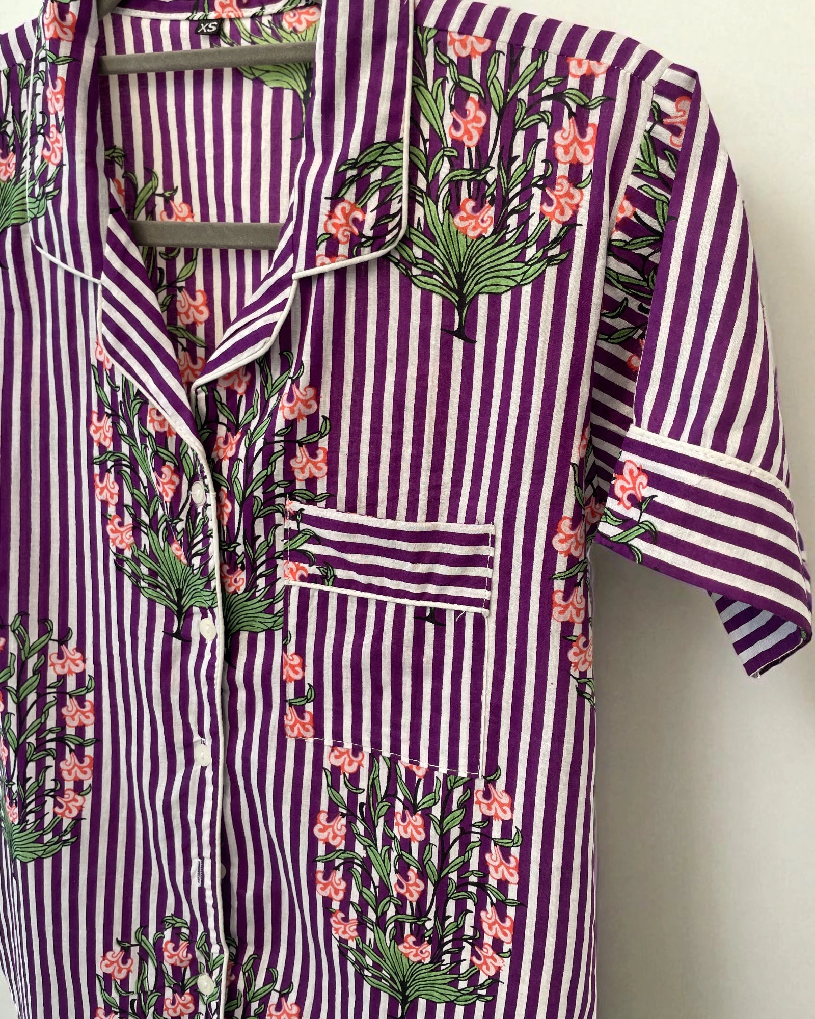 The purple and white striped cotton has been hand block printed and is complete with a piped white edging, drawstring shorts with pockets and other of pearl style buttons to the shirt.